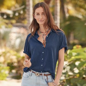 Stunning and colorful floral embroidery atop feminine swiss dot mesh breathes life into our button-down. mid-waist top with ruffles at the neckline and an eyelash finish. Camisole included. Linen. Hand wash. Imported. Exclusive. Sizes XS (0–2). S (4–6). M (8–10). L (12–14). XL (16–18). XXL (20–22). Approx. 24.5l.