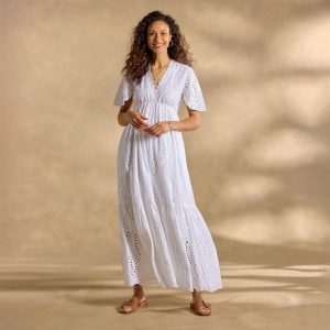 Nothing says weekend like crisp eyelet from head to toe. Fresh and feminine. our essential Juno maxi features all-over eyelet with an easy elastic waistband. flirty flutter sleeves and pretty lace trim at the neckline. Cotton. Machine wash. Imported. Exclusive. Sizes XS (0-2). S (4-6). M (8-10). L (12-14). XL (16-18). XXL (20-22). Approx. 54l.